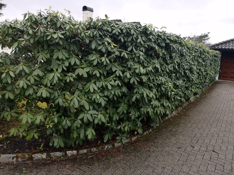 Hekk med rododendron (trolig Rhododendron 'Catawbiense Grandiflorum) Dette er enkraftigvoksende sort som tåler sterk tilbakeskjæring. Den er god som grønn hekk, men må vel være speielt flott hvis vi slipper ut blomstene. Det kan gjøres med å stoppe topping tidlig på våren. Da får skuddene god tid til å sette kopp på ettersommern og høsten. Neste vår er det full blomstring. Hvis det ikke blir full blomstring etter første vinteren, kan en la de vokse en sesong til. Slik kan en veksle mellom en grønn hekk og enkelte år med flott blomstring.